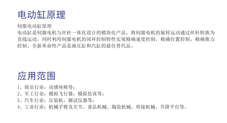 伺服電動缸是將伺服電機與傳動絲桿一體化設計的模塊化產品,將伺服電機的旋轉運動通過絲桿-螺母傳動后轉換成直線運動,同時將伺服電機的特點,精確的轉數控制和精確的扭矩控制轉變成精確的速度控制、精確的位置控制和精確的推力控制。是實現了高精度直線運動控制的全新革命性產品,并廣泛應用在航天航空實驗測試,多自由度動感娛樂,多自由度精密加工,機器人,汽車制造設備,鋼鐵連鑄,石油化工,物料搬運,注塑機,模具控制,閥門控制,精密機床,制藥機械,食品工業等領域。